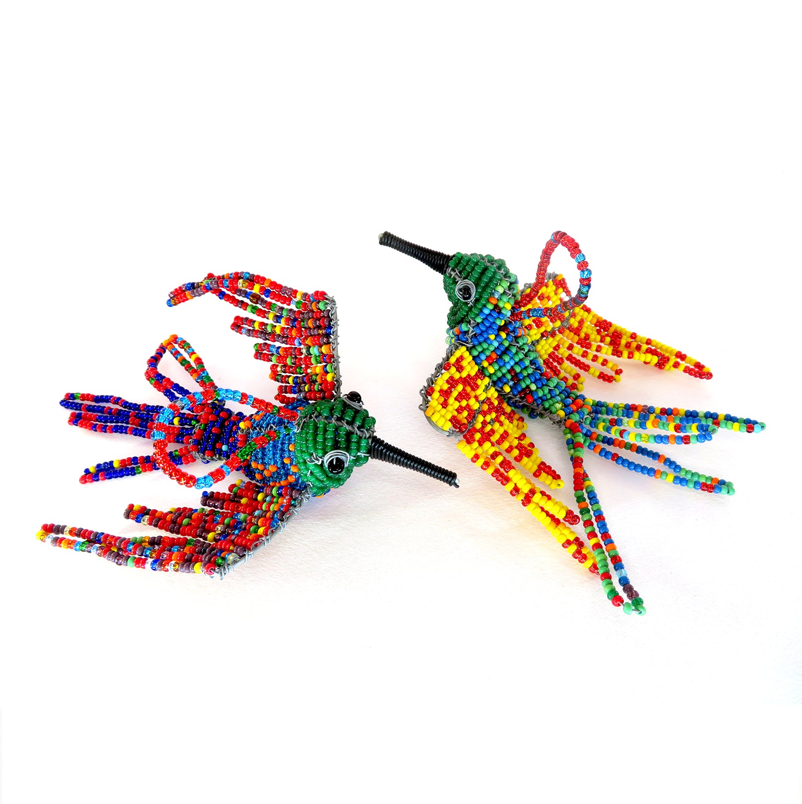 A pair of stunningly beaded sunbird decorations for an African Christmas tree.