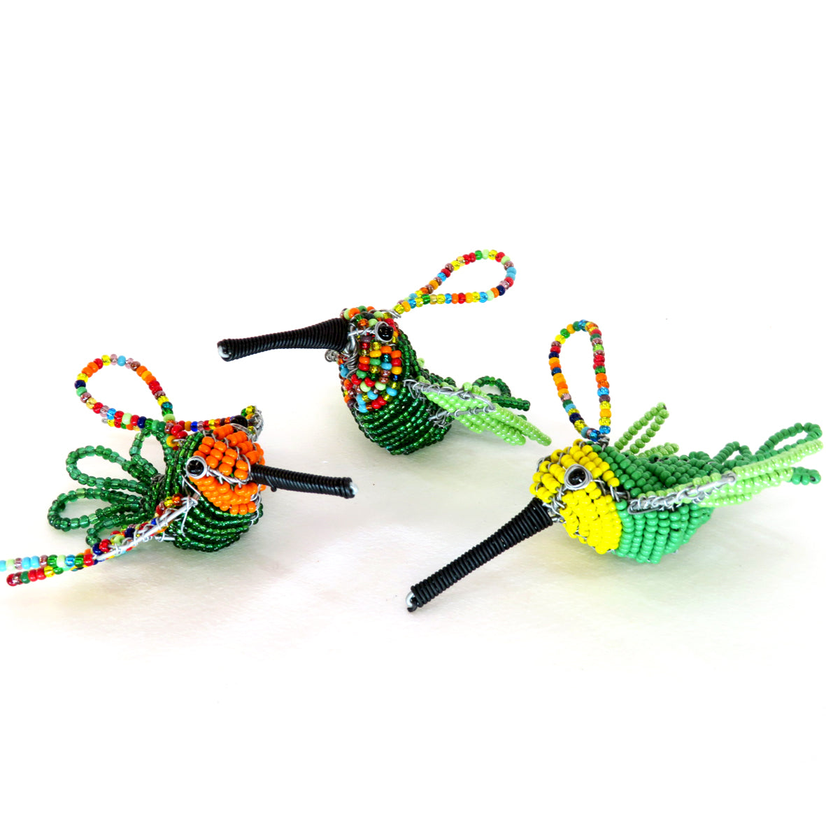 These gorgeous little sunbird decorations, with green bodies and brightly coloured features, are perfect for an African Christmas tree.