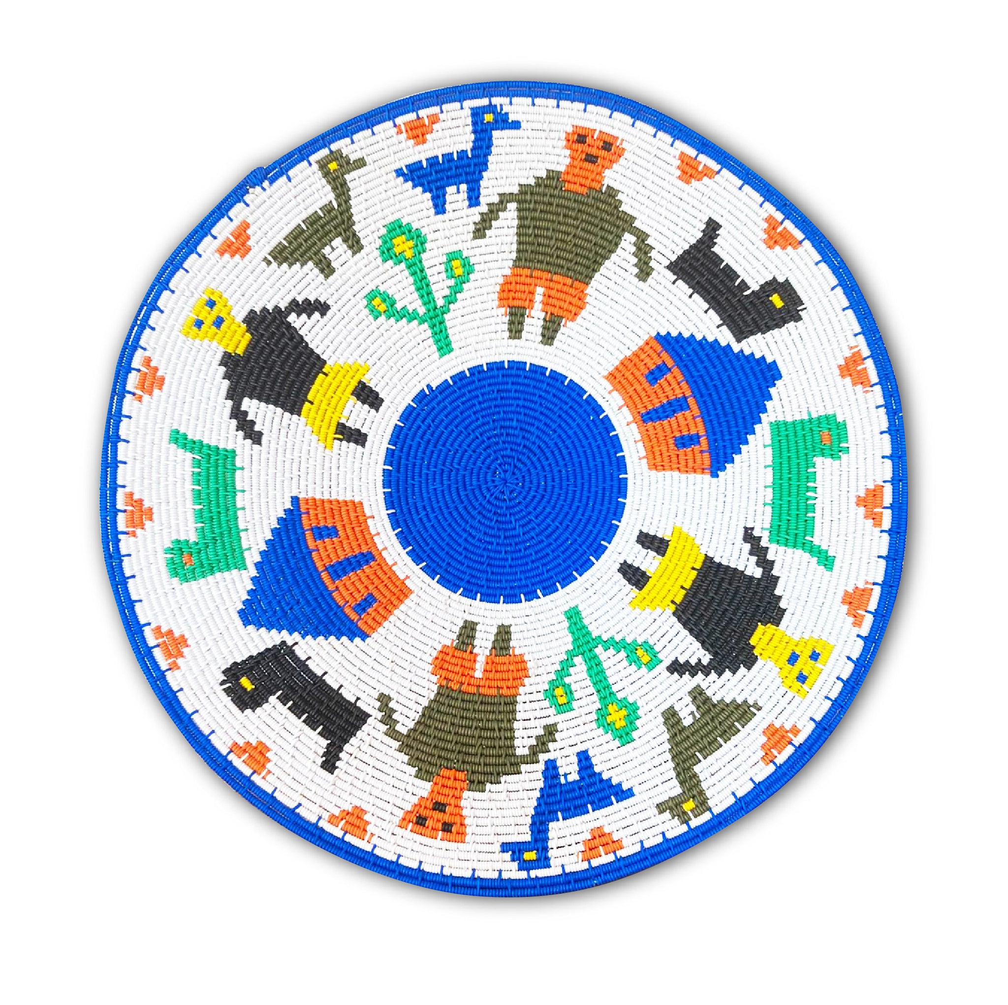 These gorgeous baskets woven from coloured telephone wire include pattern elements of huts, humans and animal figures. They are striking as table or wall decor. Expertly woven, they are a real celebration of African handcraft.