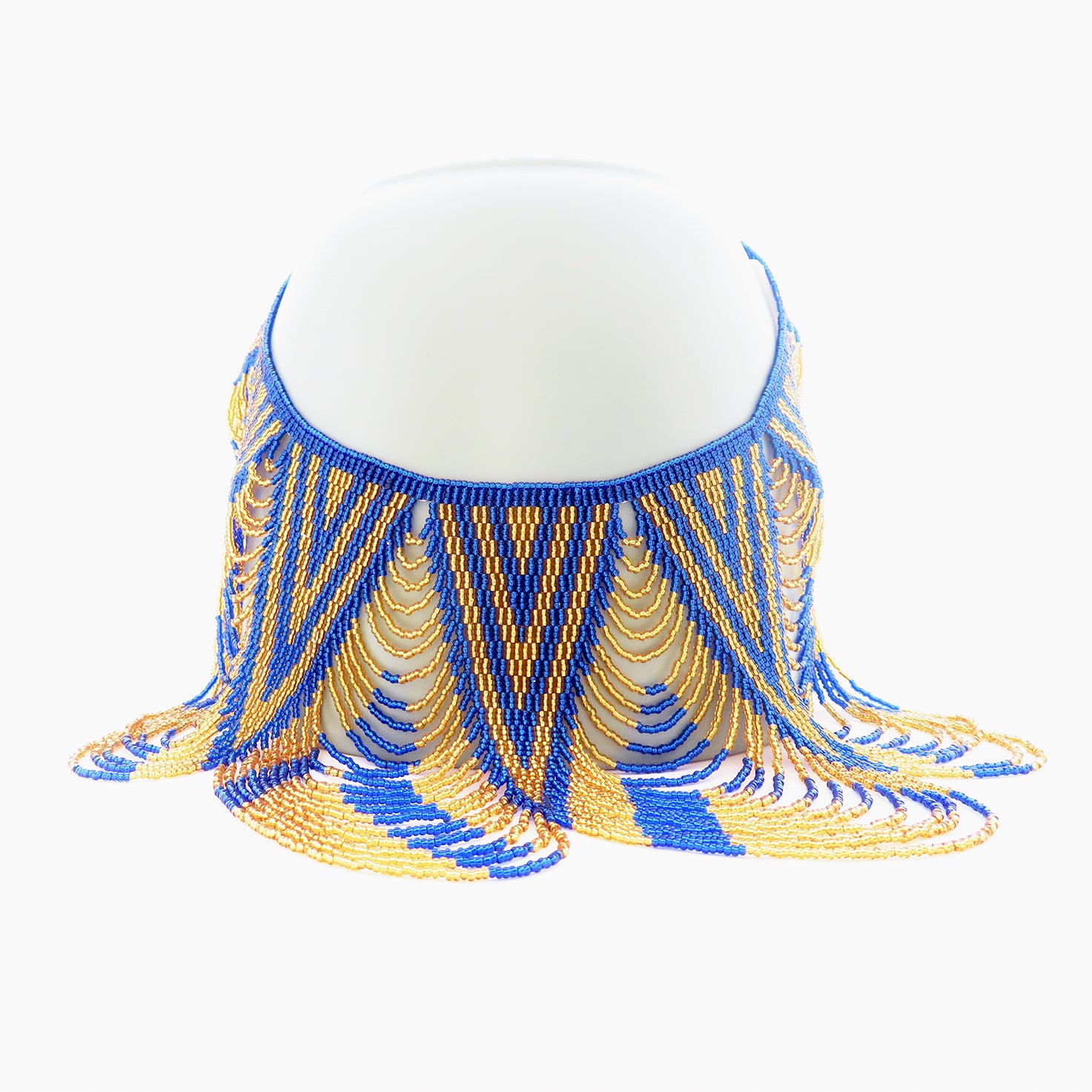 This blue and gold beaded full-collar style necklace is bold and striking.