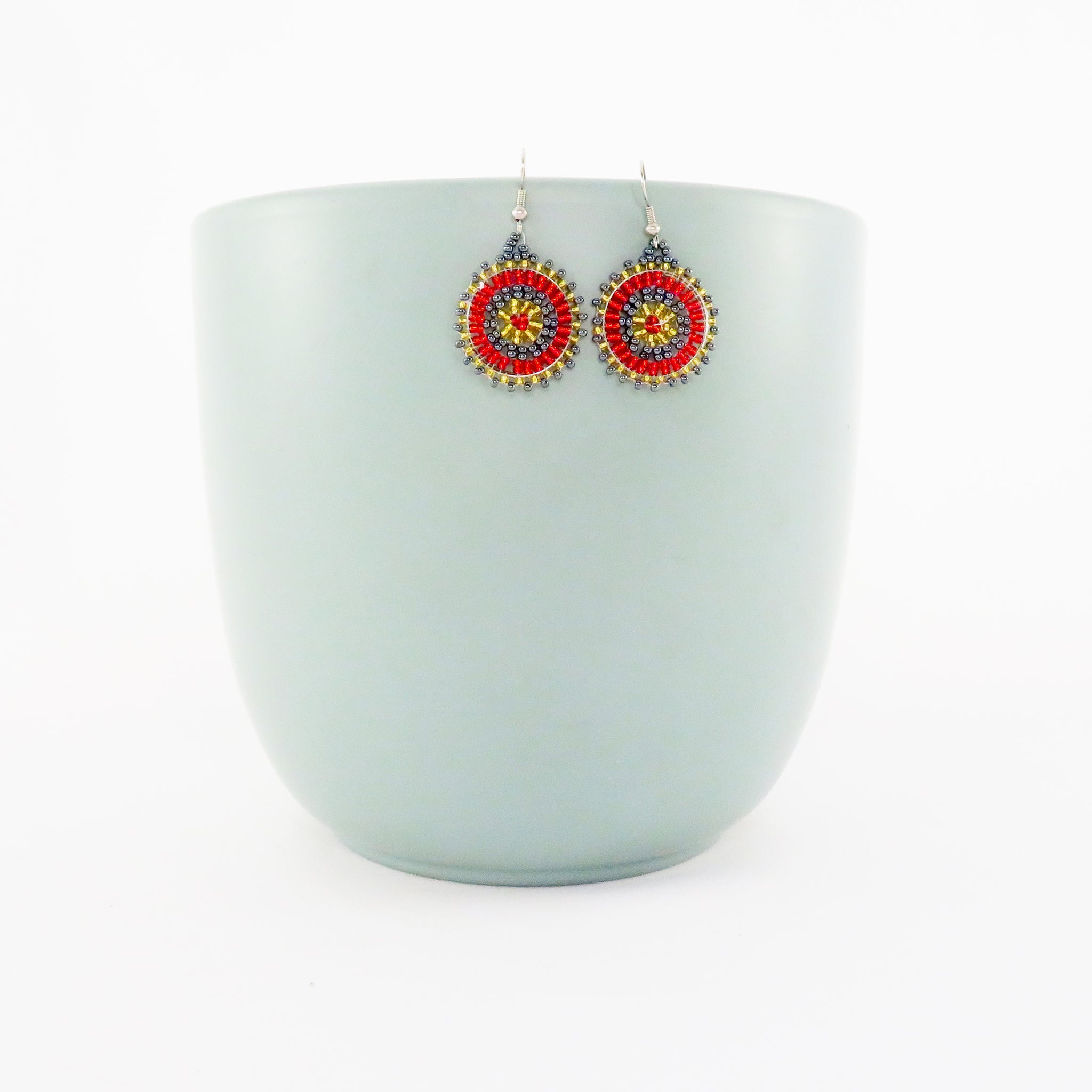 A cute pair of beaded single disk earrings in red, grey and gold.