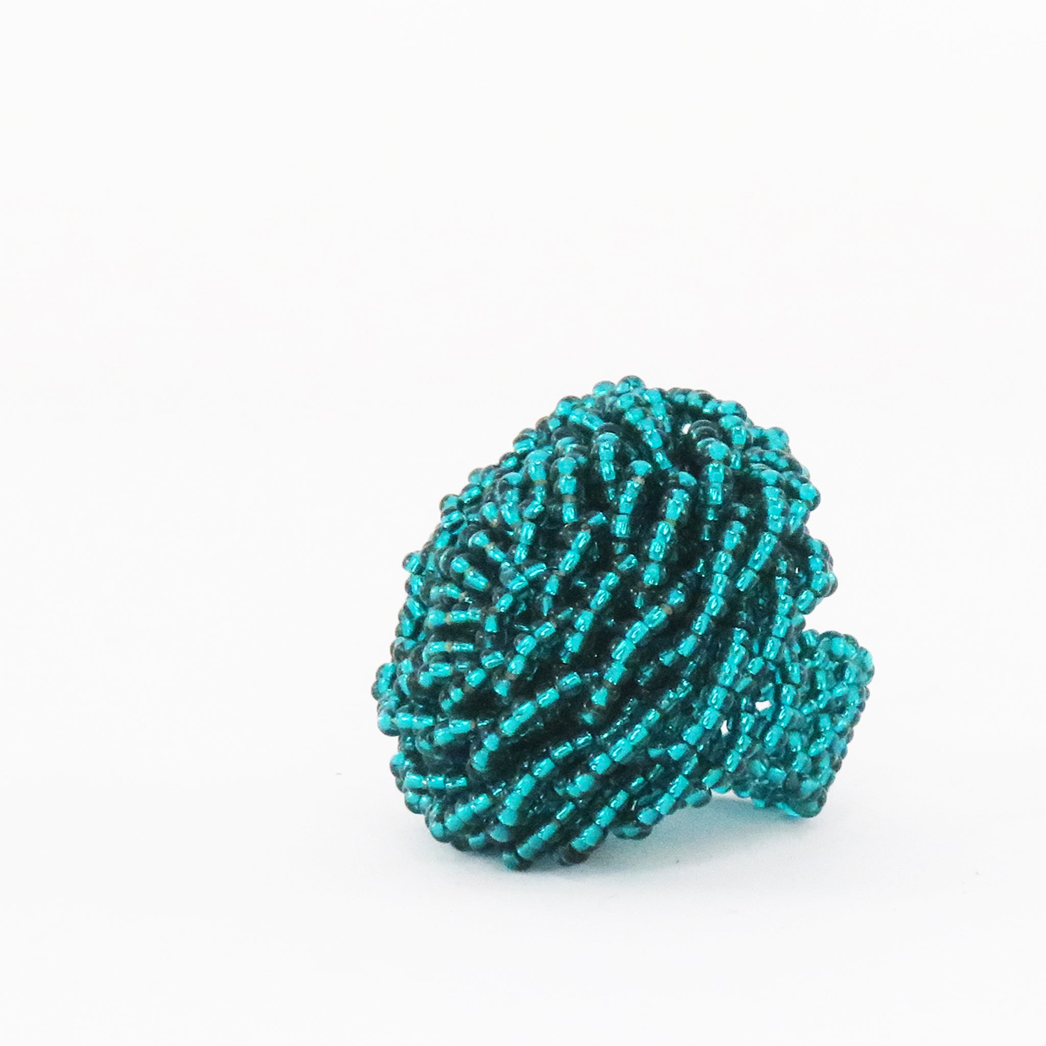 A ring of teal beads layered to resemble a rose-like flower.