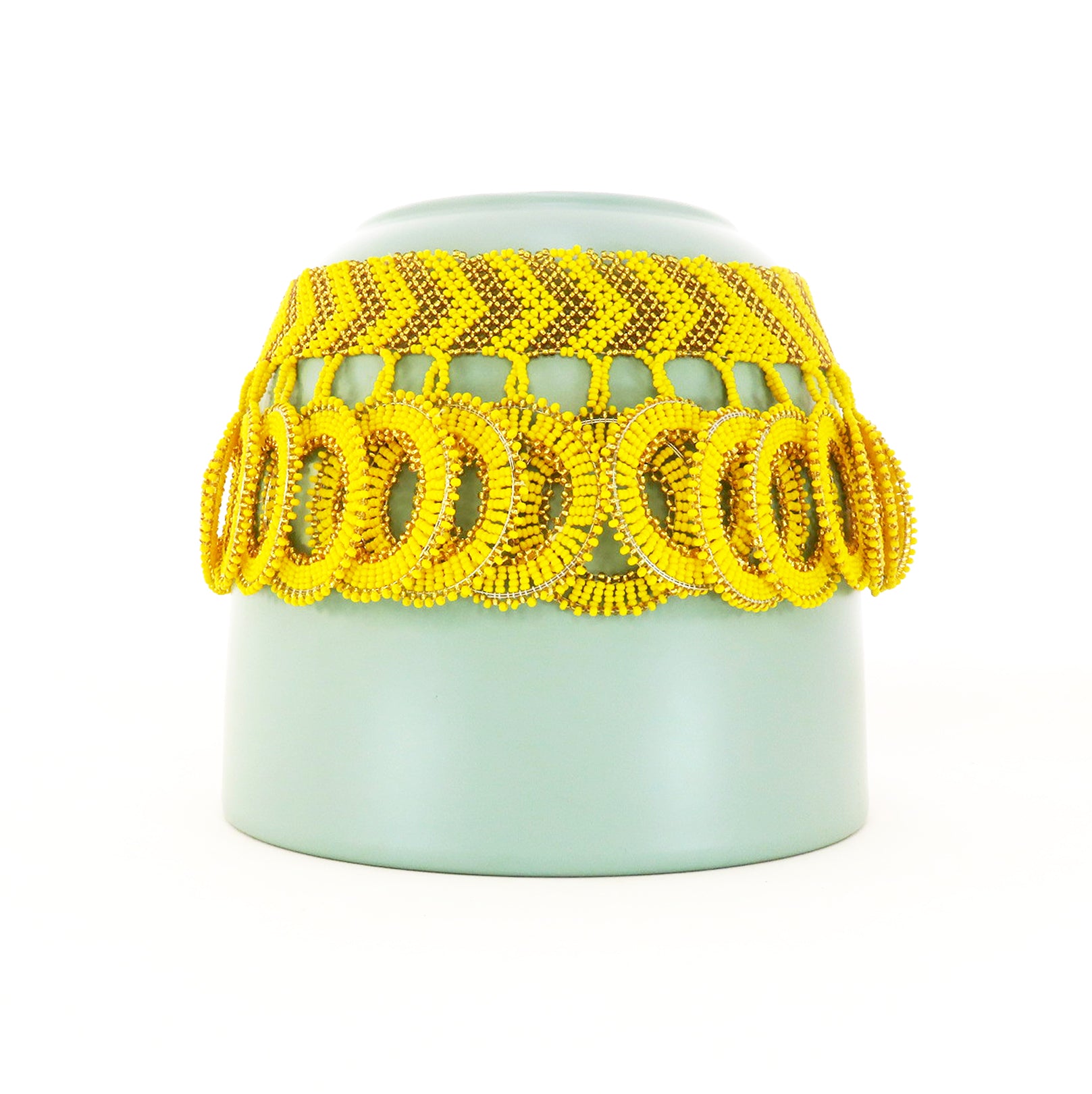 This striking yellow beaded choker-style necklace with multiple hanging rings is a real statement piece.