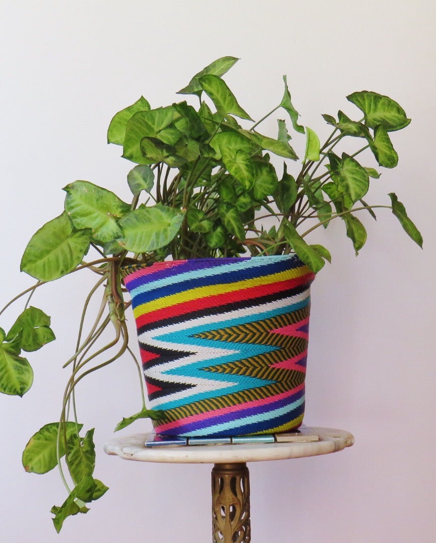 This gorgeous planter basket is woven from brightly coloured telephone wire and will make a stunning container for your indoor plants.