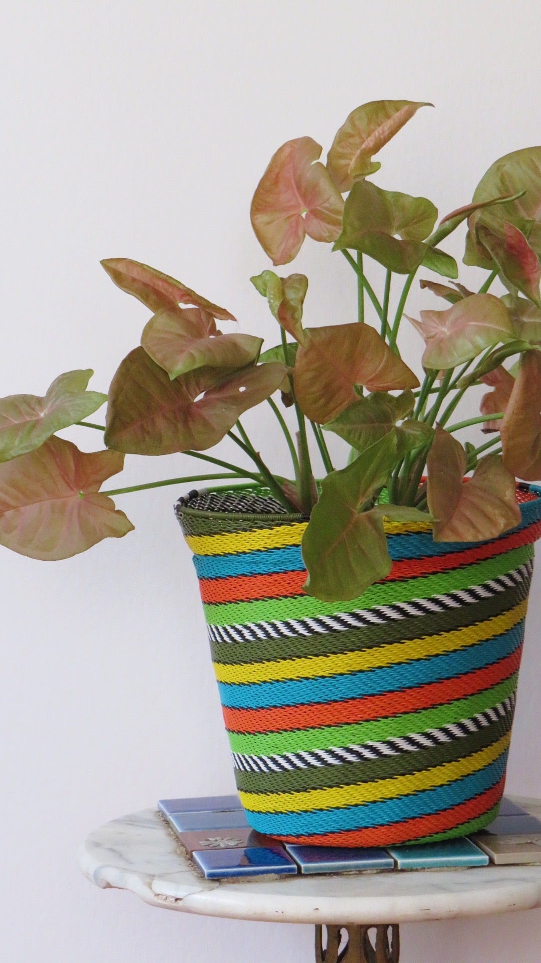 This gorgeous planter basket is woven from brightly coloured telephone wire and will make a stunning container for your indoor plants.