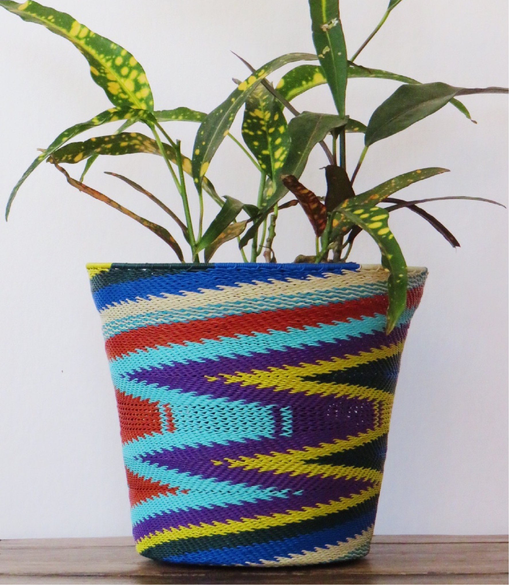 This gorgeous planter basket is woven from brightly coloured telephone wire and will make a stunning container for your indoor plants.