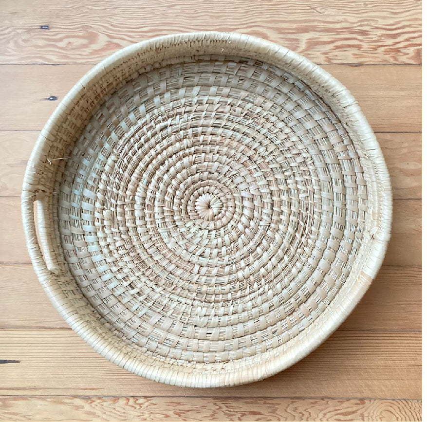 A stunning Malawian woven shallow circular basket / tray made by Richard and Precious Mahuni from Tatenda Woven Baskets.
