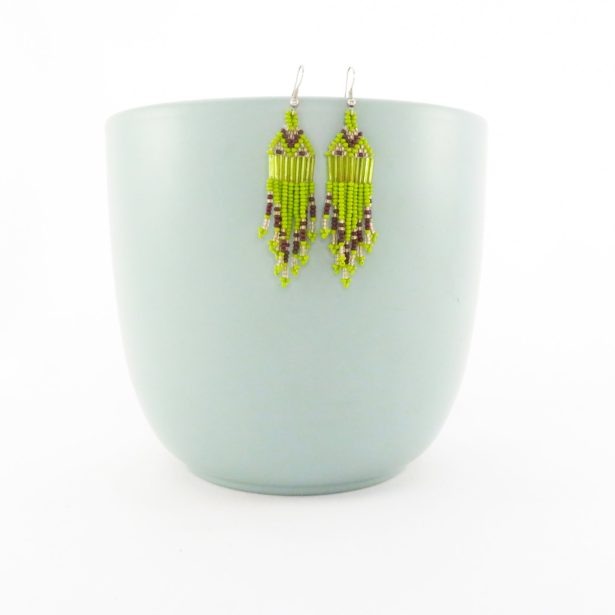 A lovely pair of green dangle earrings with accents of gold and brown.